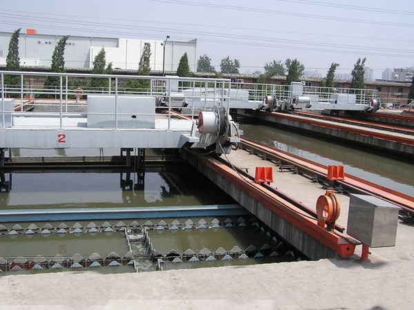 一 用途 行车式抬耙刮泥机适用于污水处理厂平流式沉淀池。其主要功能是将沉降在池底的污泥刮集至积泥槽,以便污泥回流或浓缩脱水,并将水面浮渣撇向集渣斗(如有浮渣的话),通过浮渣漏斗排出池外,以便进一步处理。运行形式是边运行边吸泥。 |